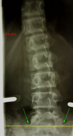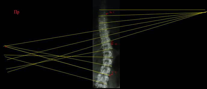 седьмого шейного позвонка и середина крестца на прямом снимке на одной