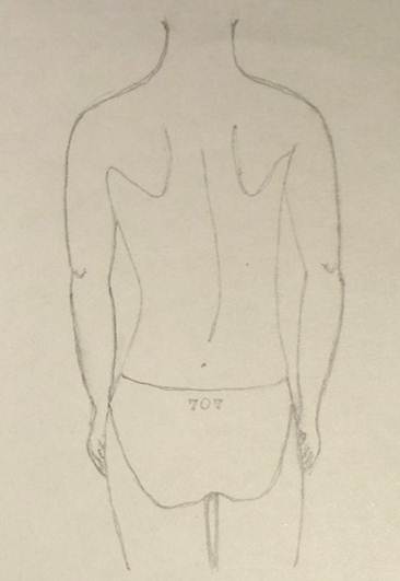 через центр крестца, увеличением имеющихся изгибов позвоночника и формированием